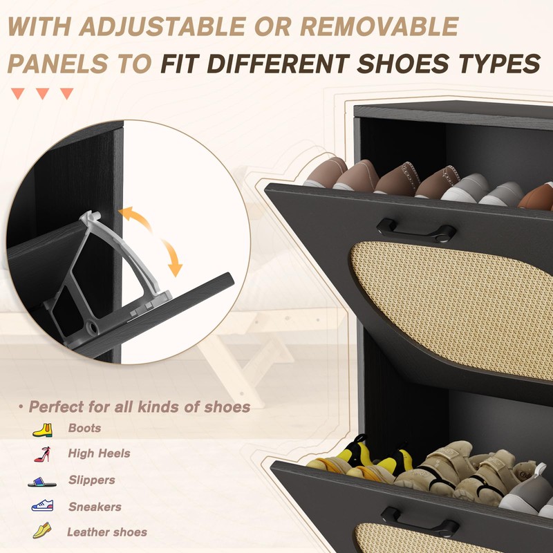 • 【High quality material】This shoe cabinet is made of natural hand-woven rattan used as the doors, providing a stable structure with excellent load-bearing capacity. The elegant black metal handle is comfortable to use and helps prevent injuries. The black metal legs separates the bottom wood from the ground to prevent moisture, making the shoe rack organizer cabinet more durable and long-lasting.