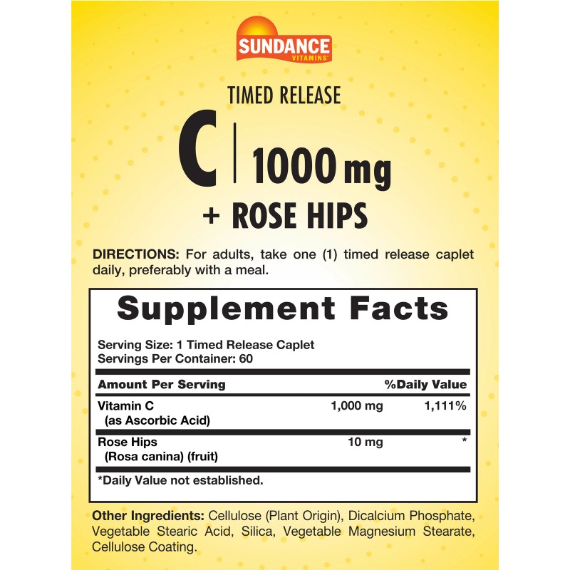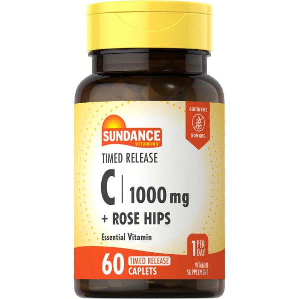 Receive essential Vitamin C with Sundance Vitamins Vitamin C timed release caplets with Rose Hips!