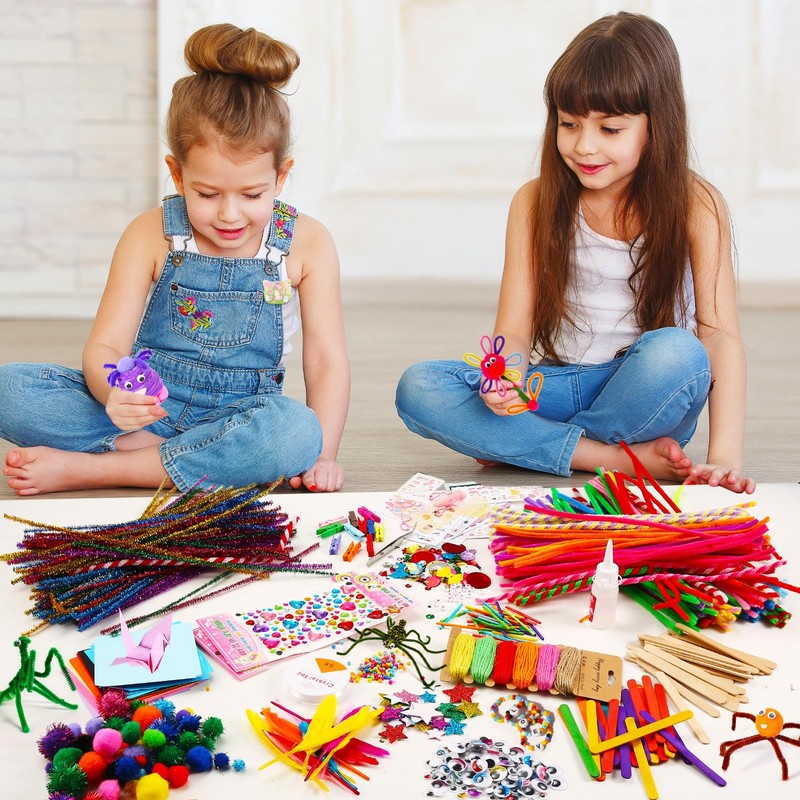 - Art Craft Supplies Set: DIY Jewelry Making Crafts Materials for Kids 6-10 - Includes Storage Bag, fuzzy sticks, craft sticks, pom poms, felt pieces, craft papers, star shapes, feathers, sequins, sheet of gemstone stickers, googly eyes, acrylic crafts guka sheet, chain, sheets oflaser stickers, beads, letter beads, craft stick, colorful craft sticks, wooden clips, Safetu Scissors, elastic thread, white glue, tweezers, nano stickers, skeins embroidery floss,