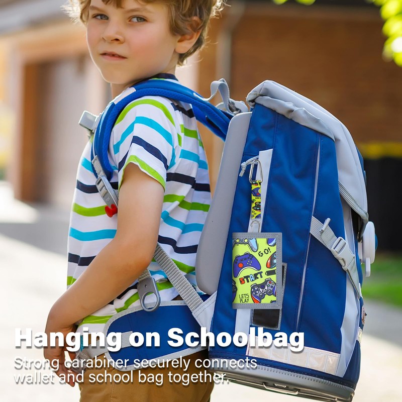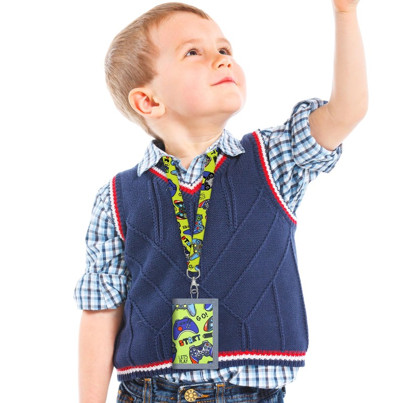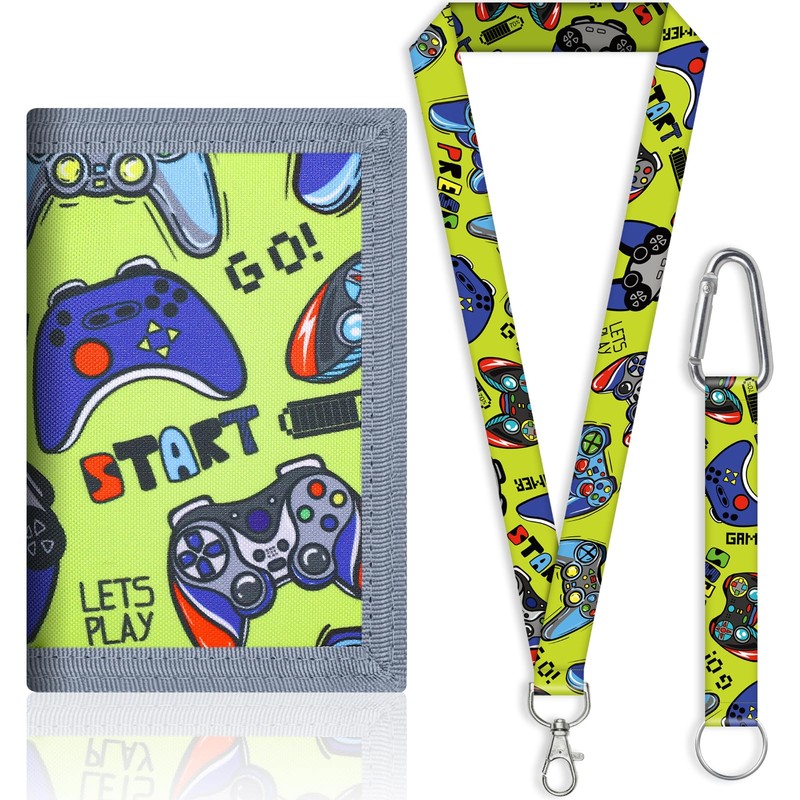 SUNDEE Children's Wallet with Lanyard for Boys and Girls, Tri-Fold Wallet with Key Ring and Zip Coin Pocket for Gifts, Original Wallet (Green Game), 4-Green Gamepad