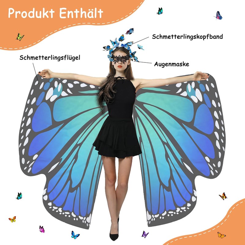 The colourful butterfly cape costume for women is an indispensable highlight for anyone who wants to stand out at fancy dress and carnival. Made from 100% polyester, this women's fancy dress costume is lightweight, durable and comfortable - perfect for long parties and dance nights. The eye-catching monarch butterfly design and vibrant colours make you shine in the crowd. With a generous size of 167 cm length and 134 cm width, the women's carnival costume offers a perfect fit for all body sizes and shapes. The cape is quick and easy to put on and take off, so you can get ready for the celebration immediately.