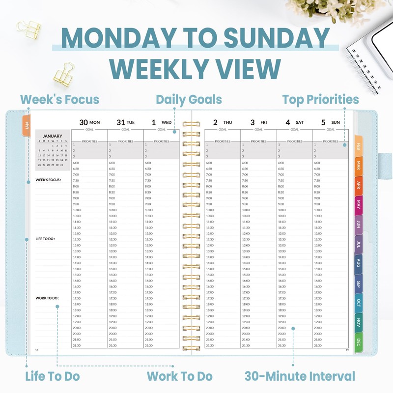 - Weekly View: 2-page weekly layout from Monday to Sunday, 30-minute time slots in increments from 6:00 a.m. to 9:30 p.m.to plan your daily schedule.Weekly pages also include Week' Focus, Life to do, and Work to do, allowing you to manage time and work-life balance.