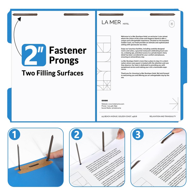 - 2 Reinforced Fasteners: Blue folders include two reinforced fasteners, ensuring documents stay organized and securely fastened within the manilla folders, preventing loss or misplacement.
