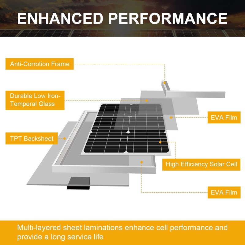 - 【Superior Quality and Material】Made of premium Grade A+ solar cells with efficiency up to 21%-30%, tempered solar glass and durable corrosion-resistant frame, withstand extreme weather conditions like UV, anti-rusting, erosion, hail, and sandstorm.
