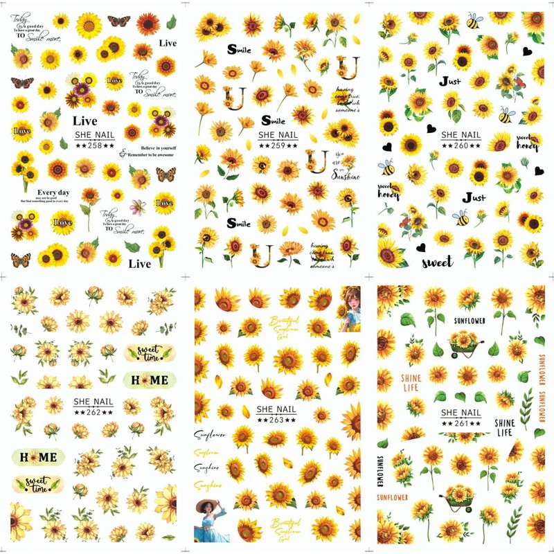 Sunflowers Nail Art Stickers Decals 3D Self-Adhesive Spring Summer Nail Decals Yellow Daisy Flowers Bee Butterfly Letters Floral Nail Supplies Nail Art Design Decoration Accessories 6 Sheets