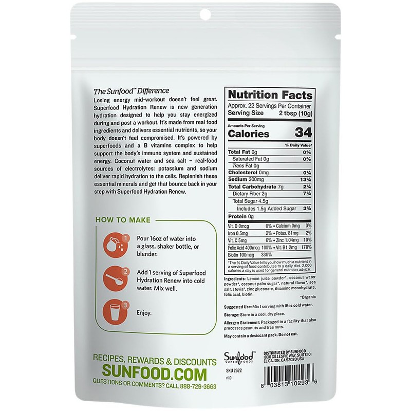 Sunfood Superfood Hydration Renew- Coconut Water Powder, Electrolytes Powder with Lemon, Sea Salt & Minerals, Clean Organic Electrolyte Drink Mix - 8 oz Bag