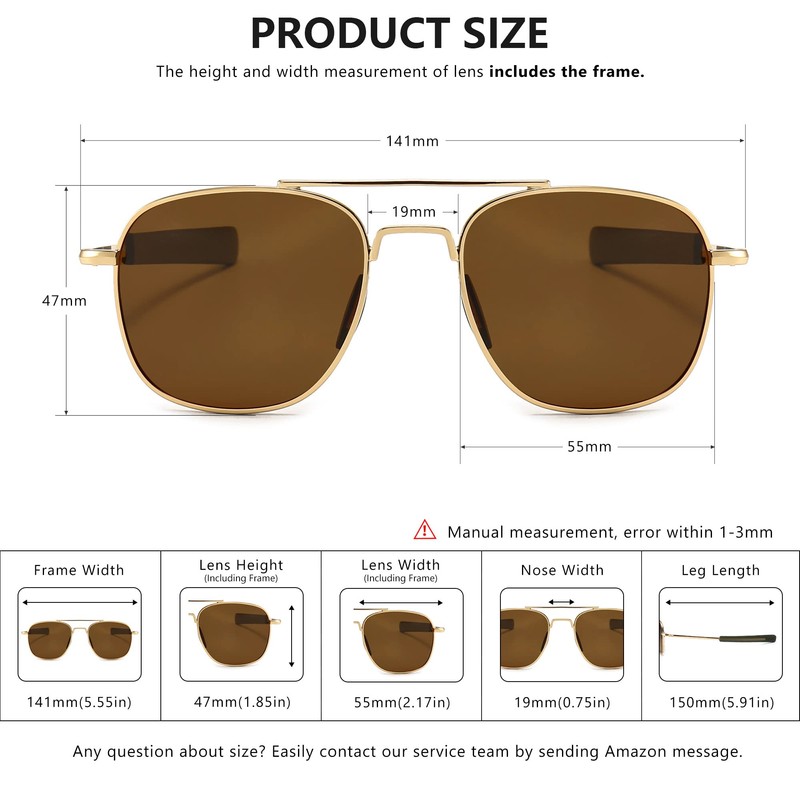 - Lens Height: 47mm/1.85inches; Lens Width: 55mm/2.17inches; Nose Bridge: 19mm/0.75inches; Arm: 150mm/5.91inches ;Frame Length: 141mm/5.55inches