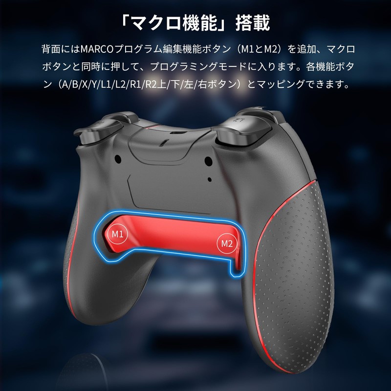 - (Macro Function & 4-Level HD Vibration): The back has a programming function button (M1 and M2) and simultaneously press the macro button to enter programming mode. The macro button can be mapped with each function button (A/B/X/Y/L1/L2/R1/R2 Up/Down/Left/Right Buttons) and can be keyed in one program. You can assign a series of key operations to a single button, which is convenient for registering multiple continuous operations and special tricks frequently used during games. Especially for fighting games, you need multiple key inputs to create one trick, so you can get a program editing with one button. Equipped with 4-stage HD vibration function, the vibrations will be transmitted to your hand when you play a sensory game, giving you the immersive feel of the game. Press and hold L1+L2+R1+R2 for 5 seconds at the same time to adjust the vibration strength (Strong, Medium, Wow, None). When you want to turn off the vibration function, adjust it to the non-vibrating mode, or turn the controller and sensor to the "controller vibration" from the Switch HOME menu