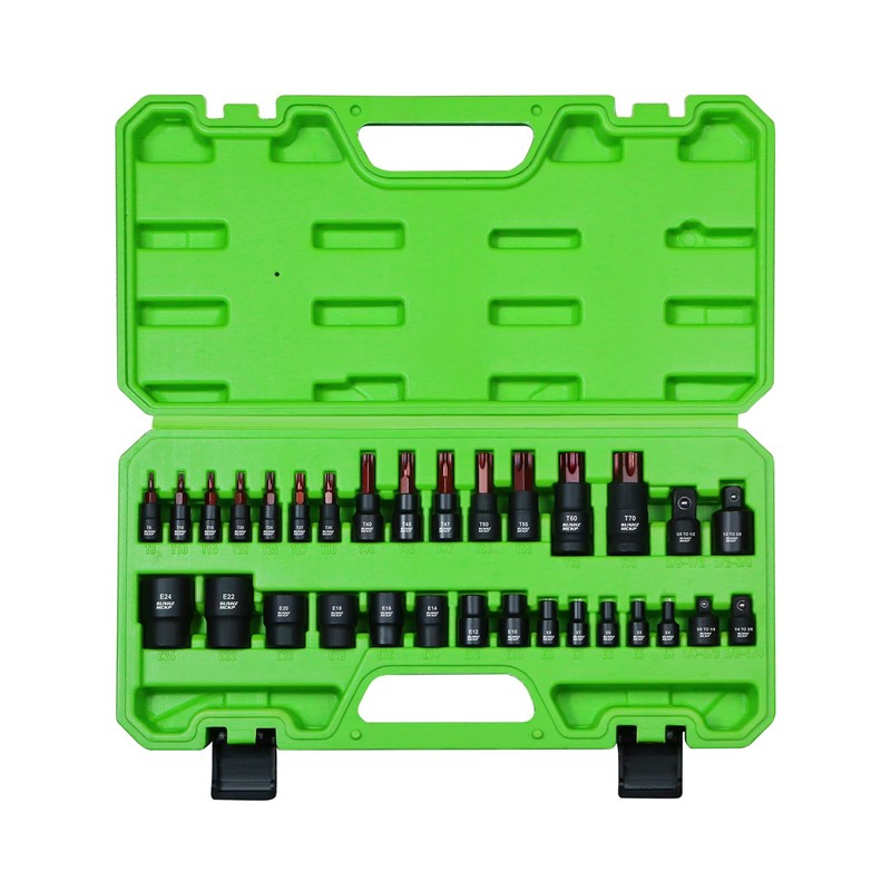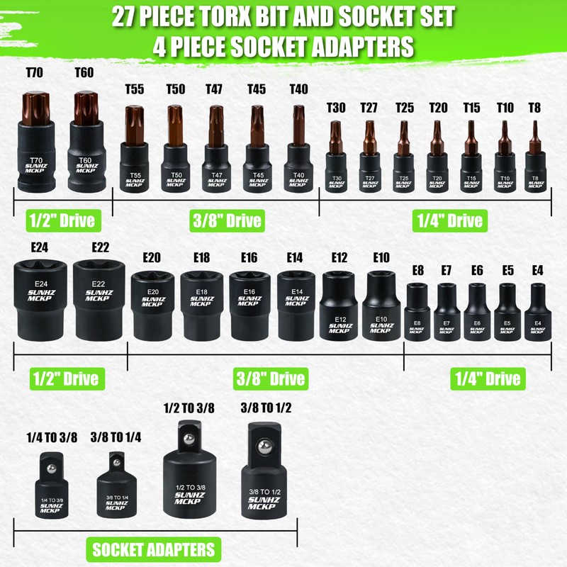- Comprehensive Coverage: Torx socket set includes 14 star (T8-T70), 13 Female E-Torx (E4-E24) sockets,1/4", 3/8" and 1/2" Drive, perfect for automotive, mechanic and DIY projects. This collection makes it a comprehensive torx bit set for all your tasks.
