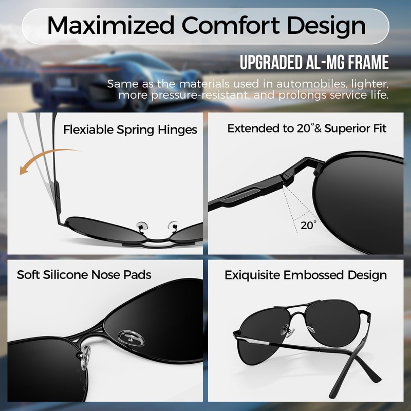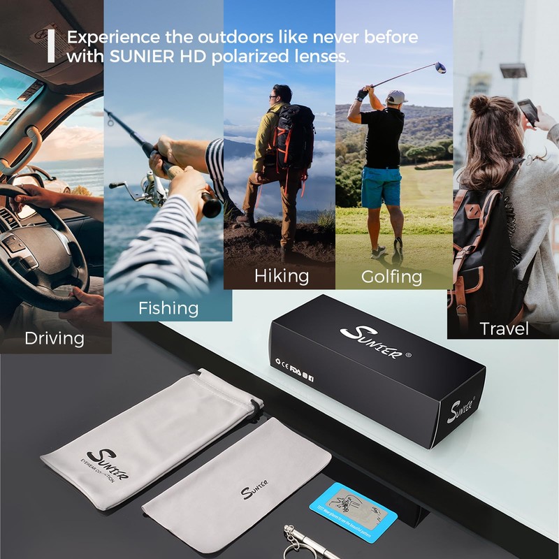 - Premium HD UV400 TAC polarised lenses - The men's Sunier sunglasses have 9-layer polarised lenses that effectively prevent glare and at the same time reproduce the colours lifelike. These sunglasses with UV400 protection protect your eyes from prolonged UV radiation and promote your eye health. Whether you are fishing, driving, boating or cycling, enjoy the beauty of your trip.