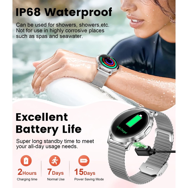 - 🤽🏻♀️【IP68 Waterproof】 This calorie tracker watch features a low-power chip and optimized battery management system, 200 mAh, with a working time of up to 2 days, allowing you to use it worry free during long outdoor activities or travels. The waterproof watch women has an IP68 waterproof rating and can be used in rain, swimming, or daily activities without taking it off. It accompanies you to explore life to the fullest 24/7 (does not support diving and ocean activities). The bluetooth watch for iphone also supports fast charging function, which only takes 2 hours to fully charge.
