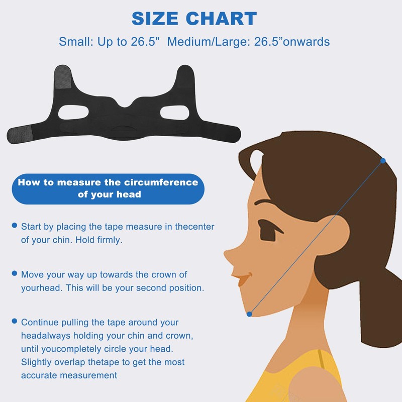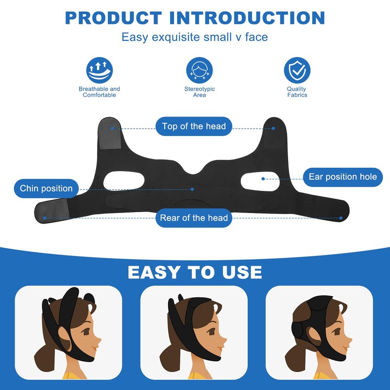 - [Easy to Use]Snoring Chin Strap is designed with ear holes and adjustable hook and loop for easy donning. All you need to do is place your chin on the chin strap, keep your ears and face in the correct position, then adjust the hook and loop, tighten the straps on the top of your head and the back of your head and you are done wearing it.