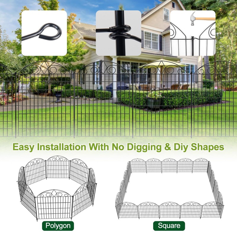 - 【No Digging & Easy to Install】The anti dig garden fence animal barrier is designed for easy installation. Just insert the two fence panels into the ring with connecting rods, fix the connecting rods in the soil with a hammer, and finally lock them to get a beautiful garden fence.