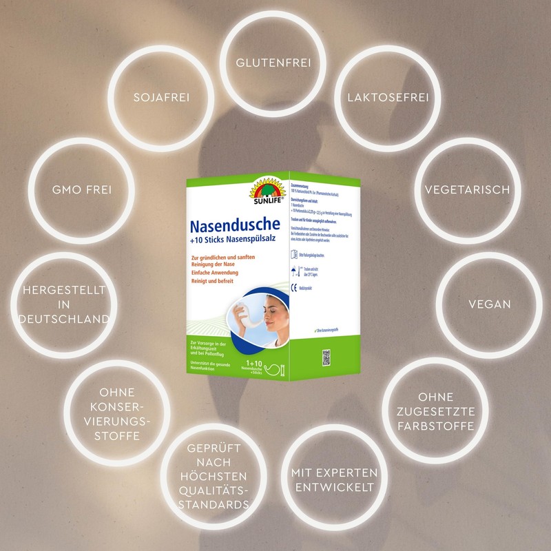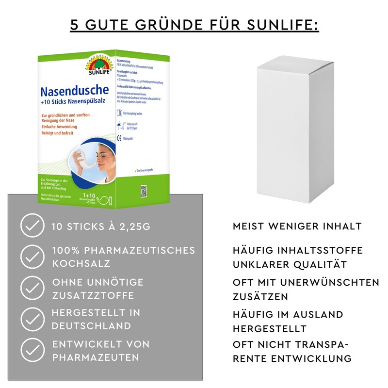 - Breathe better: Our Sunlife nasal rinse with saline solution moisturises the nose soothingly and ensures gentle cleaning and care of the nasal mucous membranes, so you can breathe deeply again.