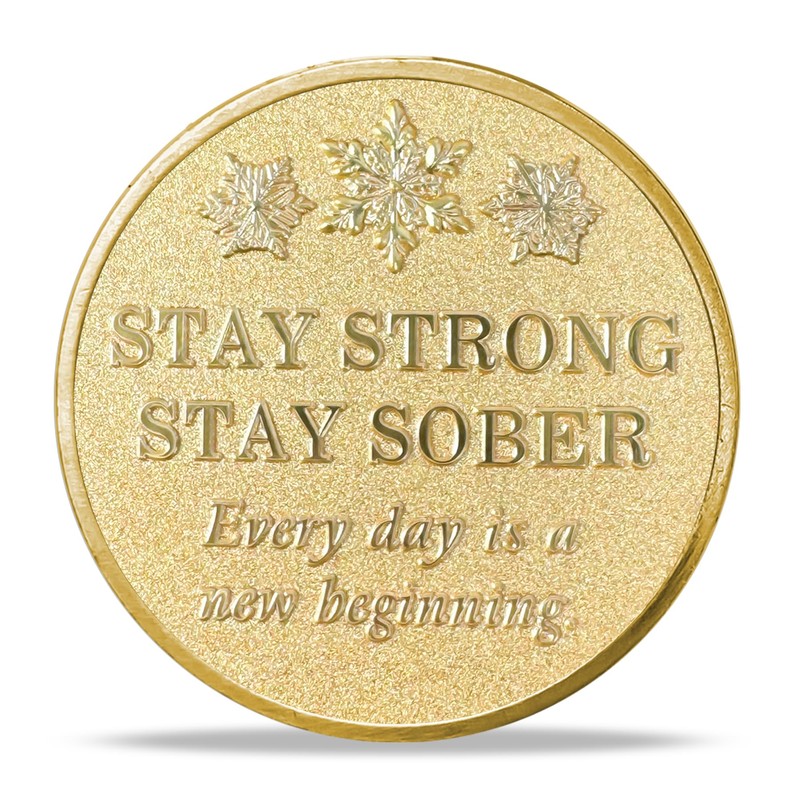- Meaningful Back Design: The reverse side of the coin features the uplifting words "STAY STRONG STAY SOBER," along with "Every day is a new beginning," against a golden backdrop decorated with snowflake designs. This message reinforces a daily commitment to sobriety, emphasizing resilience and the continuous opportunities for renewal and personal growth.