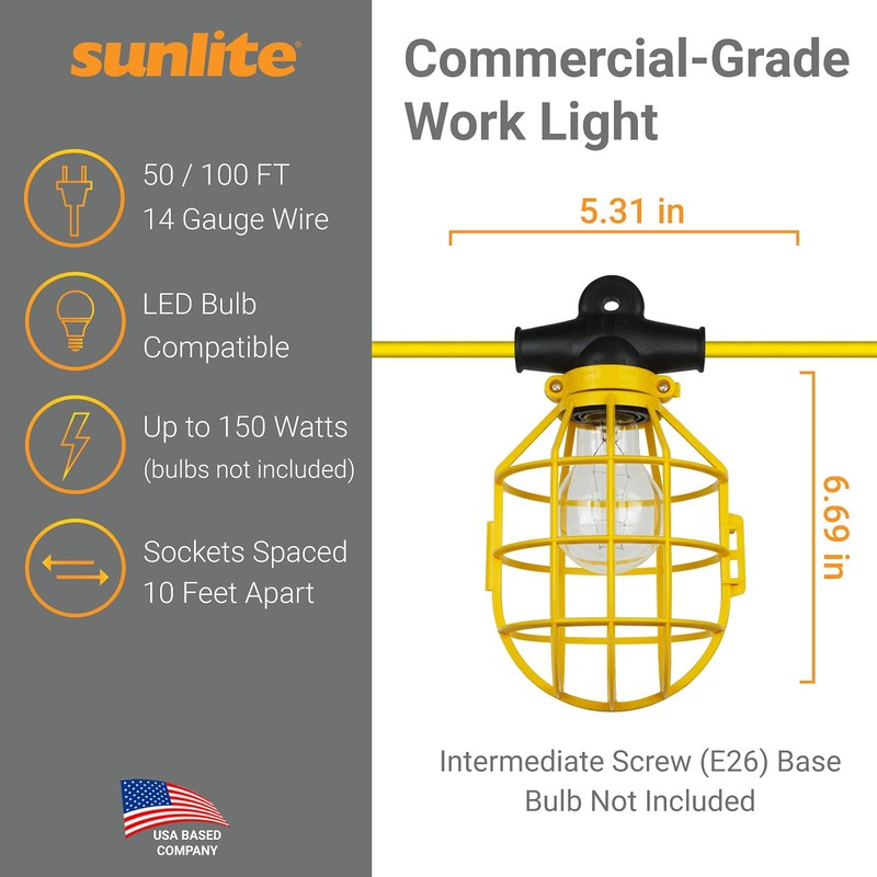 Create a safer, well illuminated work area or construction site with Sunlite Commercial-Grade Cage Light Strings. This temporary lighting solution is designed for indoor or outdoor use. Weather proof PVC coating on the sockets and 14 gauge wire is designed to withstand the elements while plastic cages help protect the bulbs from damage. Bright yellow color for high visibility. Each 50-foot string features 5 medium base sockets (E26) spaced 10 feet apart. 5 feet of lead and 5 feet of cord at the end of the string with covered plug allows you to connect multiple sets together for a larger coverage area. Cages are designed to accommodate standard A19 to larger A23 size bulbs of up to 75 Watts (bulbs not included). Use with LED bulbs for a more energy efficient lighting solution. Each socket has an eyelet on top that can be used to hang in place. Use on job sites, in attics, basements, storage areas, stairwells, parking lots, outdoor markets, marinas, or anywhere extra light is needed. ETL Listed for quality and safety.