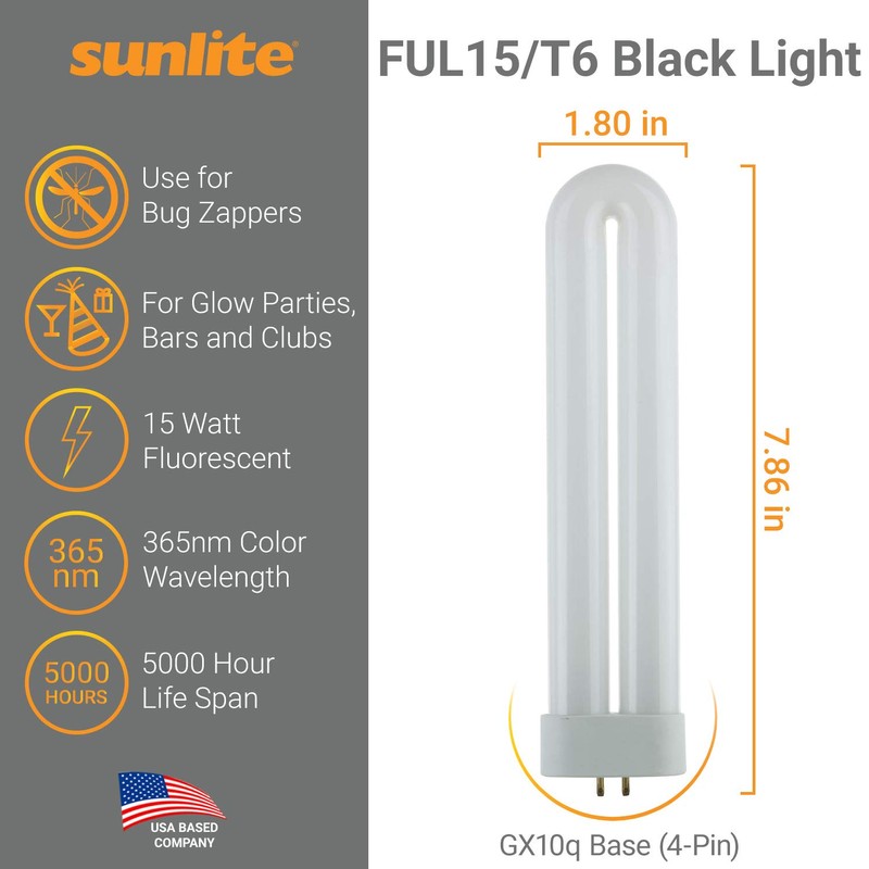 SUNLITE 40484-SU FUL15T6 Fluorescent Black Light Bulbs, 15 Watts, GX10q 4-Pin Base, UV Light, 365nm Color Wavelength, 5,000 Hour Life Span, Perfect for Bug Zappers, Clubs, Bars, 5 Pack