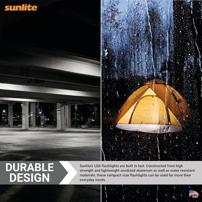 - DURABLE CONSTRUCTION - Sunlite LED flashlights are constructed from high strength, lightweight anodized aluminum. Knurled body for a non-slip grip and faceted sides to keep it from rolling away