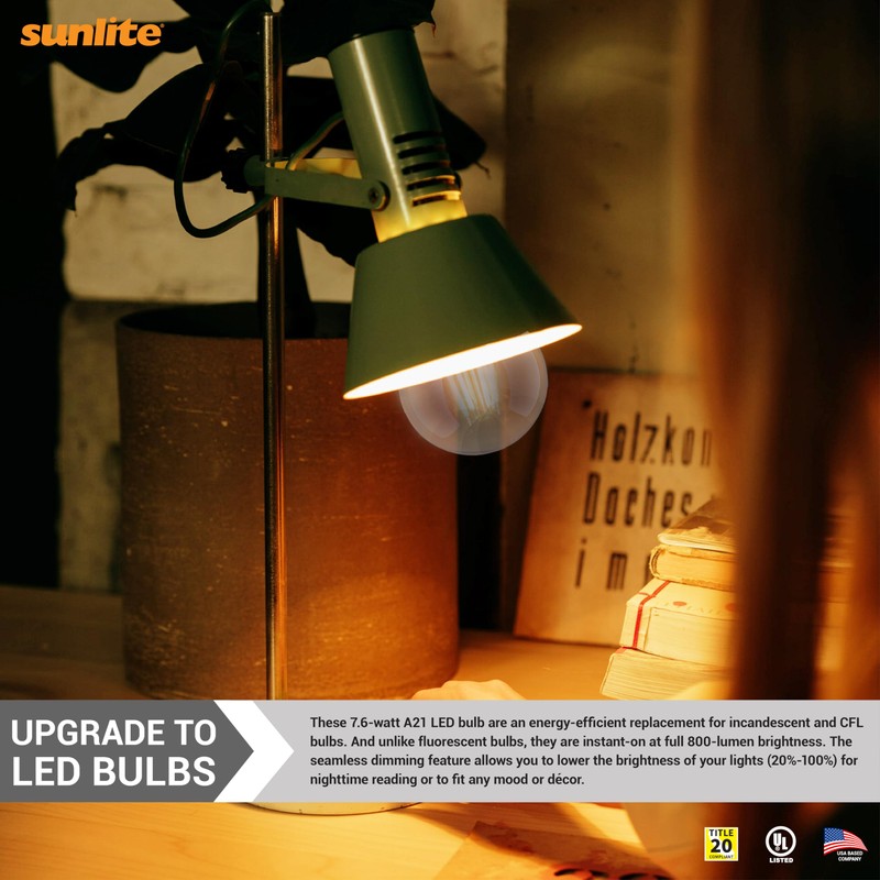 • ENERGY EFFICIENT - The Sunlite a19 dimmable led bulb uses just 7.6 watts and is led light bulbs 60 watt equivalent save time, money and energy compared to incandescent light bulbs 60 watt standard bulbs