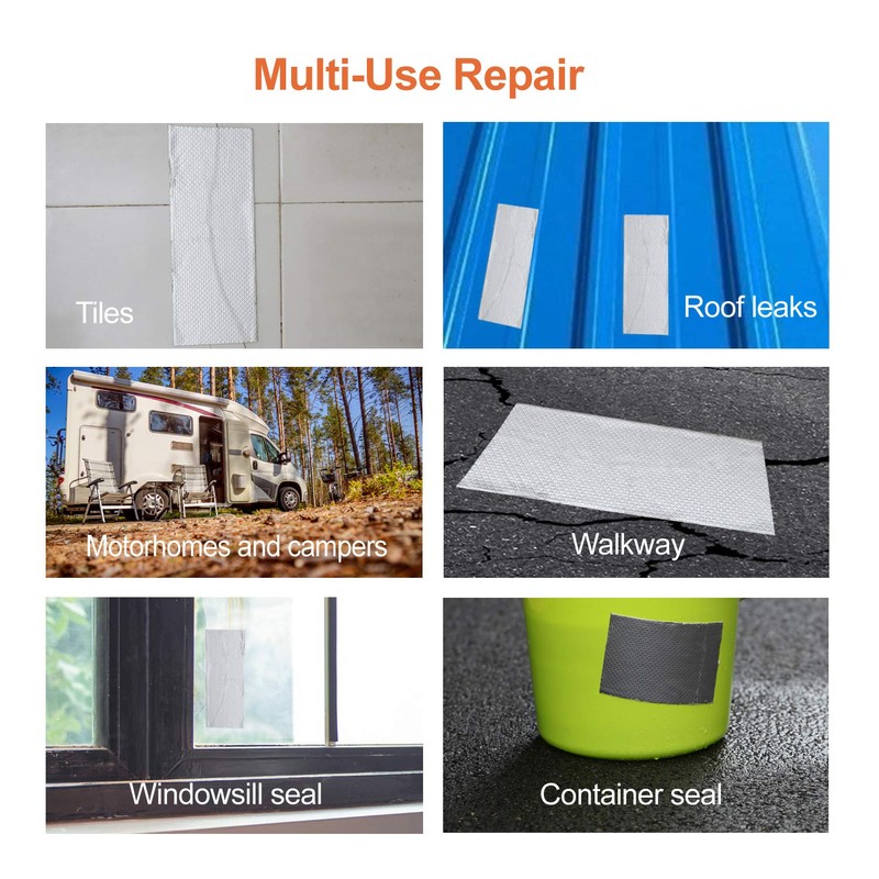 Multi-functional super sticky adhesive butyl seal tape that can fix any leaking issue for a long long time! Our butyl duct tape is what you are looking for! Made of non woven fabric covered with aluminum foil, added anti-corrosion and anti-aging film, the corrosion resistance and anti-aging effect were stronger. thicker and heavier than similar products, toxic-free, strong adhesive, high density waterproof, UV resistant, vapor prevent. Once applied on the target object, the repair tape is tightly adhered on the surface, providing a mess-free and airtight sealing for RV, window, boat sealing, glass, glazed tile and EPDM rubber roof patching and it can resist extreme temperatures from -40 ℉ to 248 ℉. **Features:** 1\. The butyl seal tape is made of pure butyl rubber, non woven fabric covered with aluminum foil--upgraded PET aluminum coating, the surface layer is not easy to peel and fall off, service life is longer. 2\. High adhesion strength, strong viscosity persistence and high peel strength, Great reflective heat insulation effect; 3\. Elongation rate of 1000%, Aging resistance 30 years; 4\. Easy to install, quickly and ideally on tight corners, textured, uneven, and most jagged surfaces. **Package Included:** 1 x Adhesive Butyl Tape: Length: 10m (33 ft) x Width: 15cm (6 inch) x Thickness: 1.2mm(1.58 Milli-inch) **Instruction for use:** 1\. Clean the base surface, make sure the surface clean and dry before application. 2\. Align the width of the desired base gap and cut the butyl seal tape into the size needed. 3\. Peel off the released film on the back of the tape. 4\. Repeatedly press the butyl sealant until the tape is fully stuck with surface, apply the tape and don't move it within 24 hours.