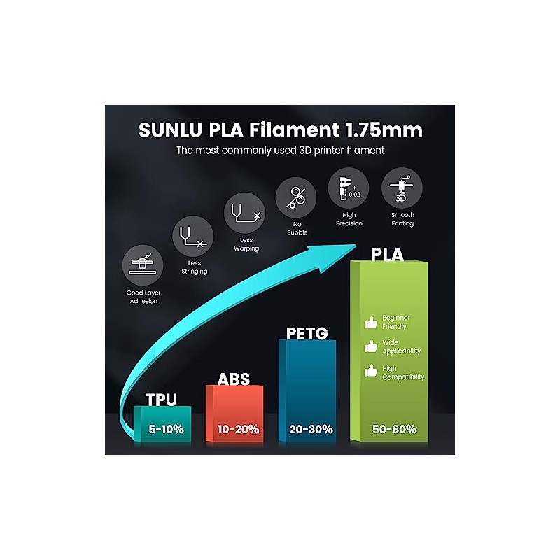 - ١SUNLU PLA 3D Printer FilamentPLA material is the perfect choice for 3D printing enthusiasts! SUNLU PLA filament is reliable, versatile, and easy to use. No clogs, bubbles, or tangles, its excellent layer adhesion ensures high-quality prints every time. Ideal for beginners and experienced users.