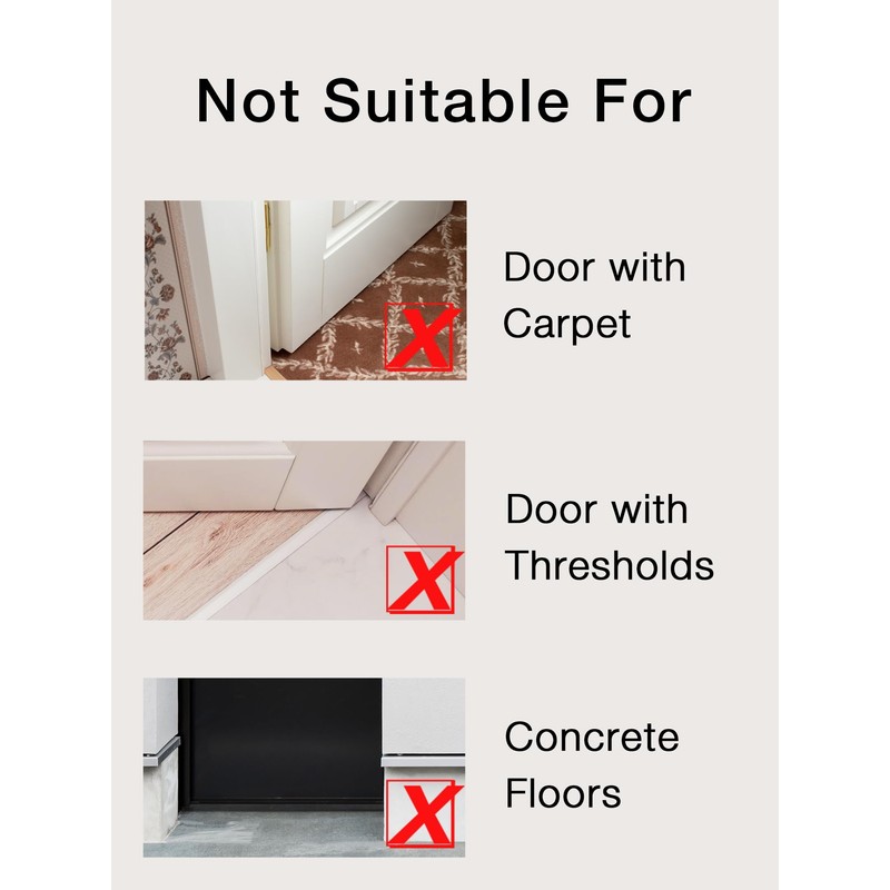 - [Applicable Doors]:This door seal is suitable for most types of doors, but doors with blankets, doors with thresholds, concrete floors, and doors that are not covered by the dimensions.