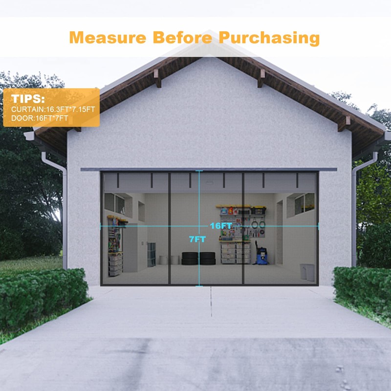 - SIZE TIPS The size of this hidden screen door is 16.3ft * 7.15ft, and it FITS door size up to 16ft * 7ft. Please Measure your door first, choose the size according to outer diameter. Don't buy the one which is smaller than your door frame.The car garage screen door can be used in many places, such as a rec room, outdoor workshop, a home gym, an arts and crafts room, a man-cave, or a kids play.