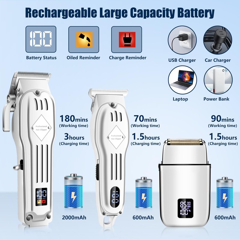 - Smart Digital LCD Display & Long-Life Li-ion Battery : The ultra-clear LED can clearly show you the remaining charge, battery status and remind you to drip blade oil in time. Built-in 2000 mAh high capacity battery, charge for just three hours and get up to one hundred and eighty minutes of cordless use. This premium hair clipper set is great for travelling, holidays, business trips