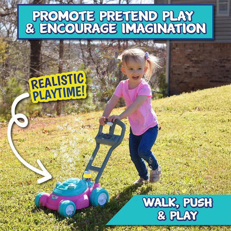 - Just push the mower and have fun with bubbles in seconds! No batteries required. As the mower is pushed, it releases tons of incredible bubbles in to the air.