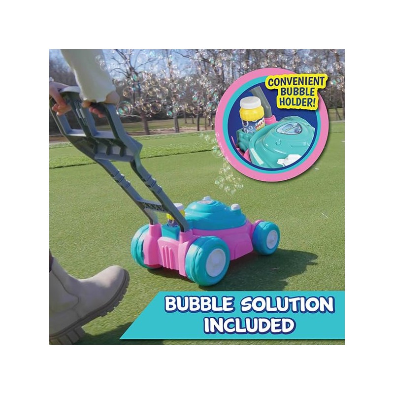 - Parents will love the newly designed bubble wheel with mess-free construction. Assembly is quick is easy. Simply slide the ends of the handles on to the mower, pour in your solution and you're ready to go!