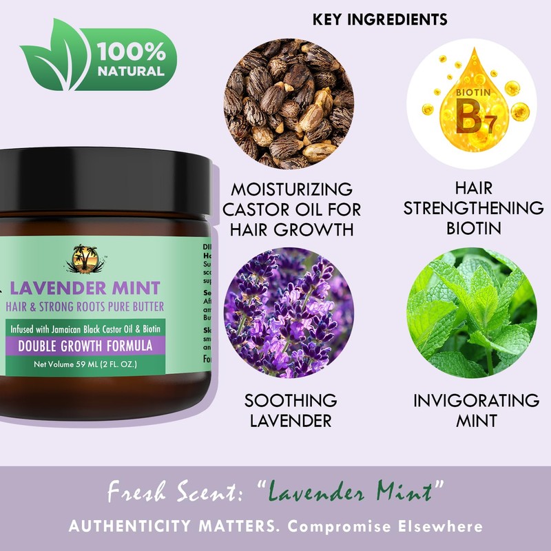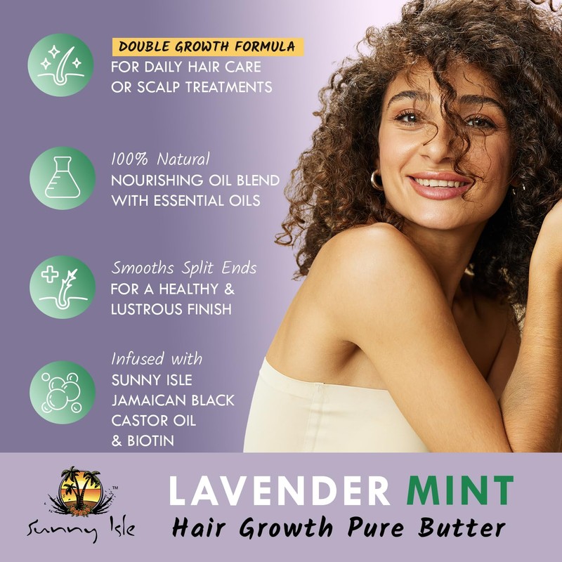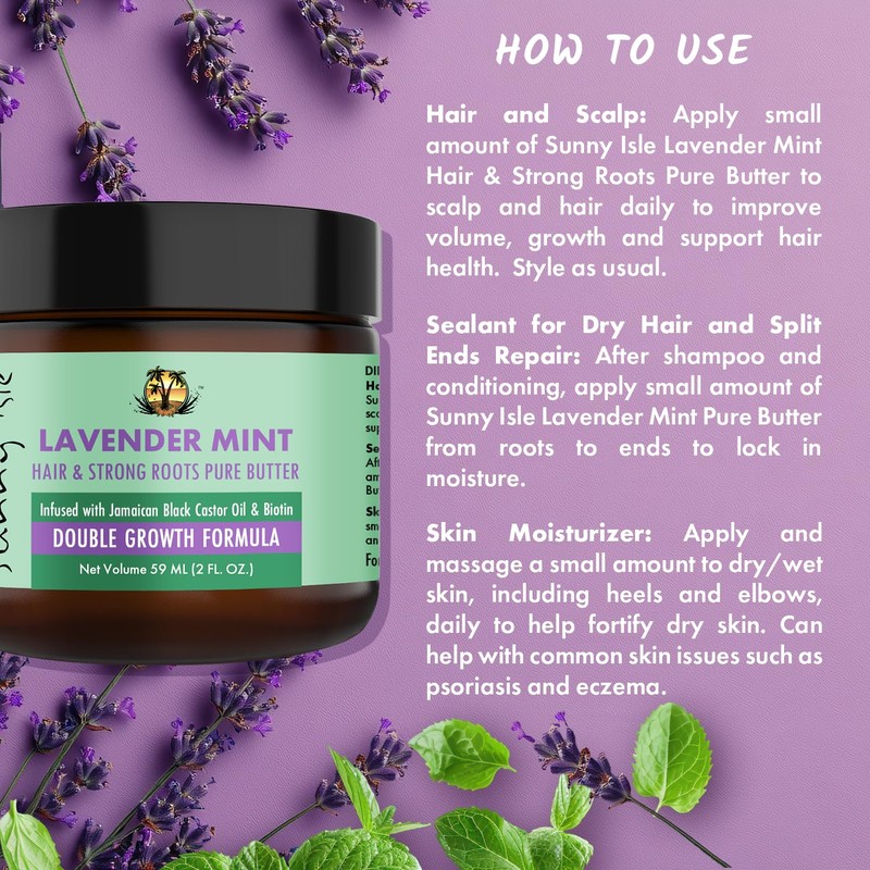 - MOISTURIZING & SOOTHING FOR DRY SCALP: Sunny Isle Lavender Mint Hair & Strong Roots Pure Butter is formulated with Biotin, Jamaican Black Castor Oil, and a curated blend of essential oils and other natural oils to deeply condition the scalp, stimulate hair growth, while soothing dry, irritated, itchy scalp.