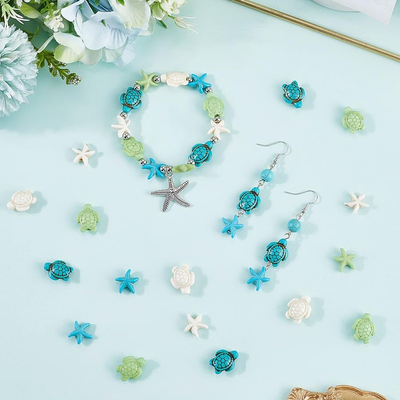 SUNNYCLUE 1 Box 120Pcs 6 Styles Turquoise Sea Turtle Beads Blue Starfish Beads Synthetic Sea Star White Green Tortoise Summer Ocean Beach Loose Spacers for Jewelry Making DIY Bracelet Necklaces