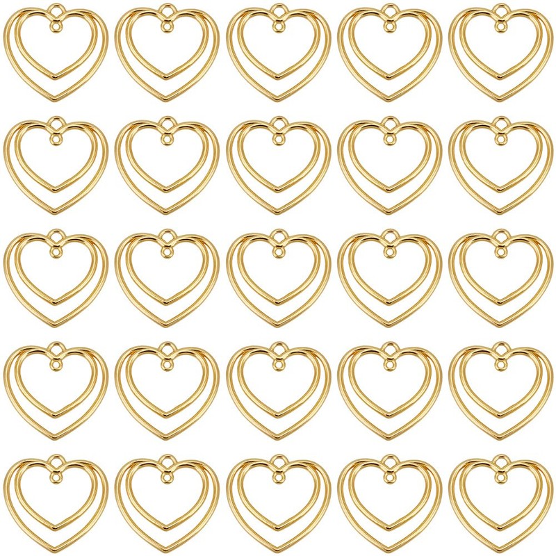 SUNNYCLUE 1 Box 50Pcs Double Heart Bezel Charm Gold Heart Connector Charms Alloy Love Pressed Flower Blank Frame Hollow Pendants Links for Jewellery Making Finding Earrings Necklaces Bracelets Crafts