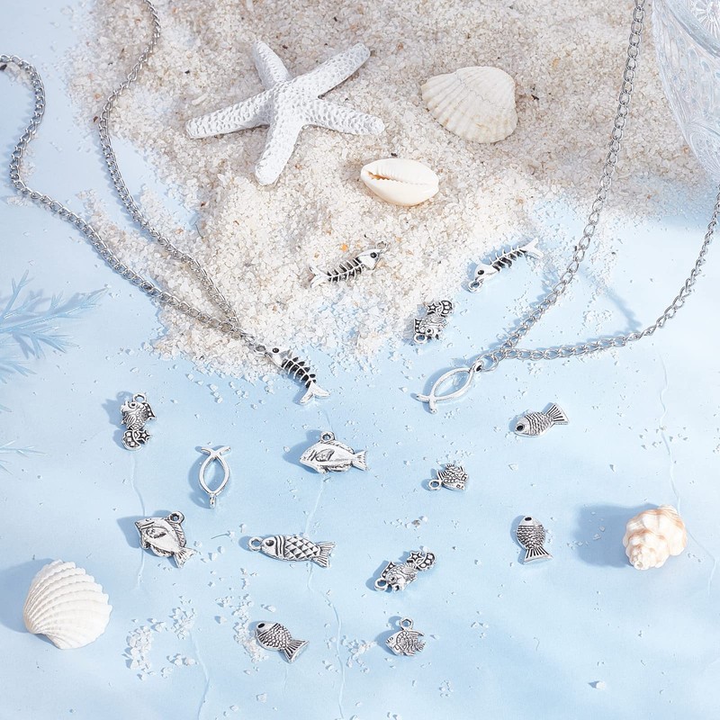 SUNNYCLUE 1 Box 80Pcs 8 Styles Fish Charms Bulk Tibetan Style Fishbone Goldfish Hollow Sea Ocean Animal Alloy Pendants Antique Silver Plated for Jewelry Making Charms DIY Bracelets Supplies