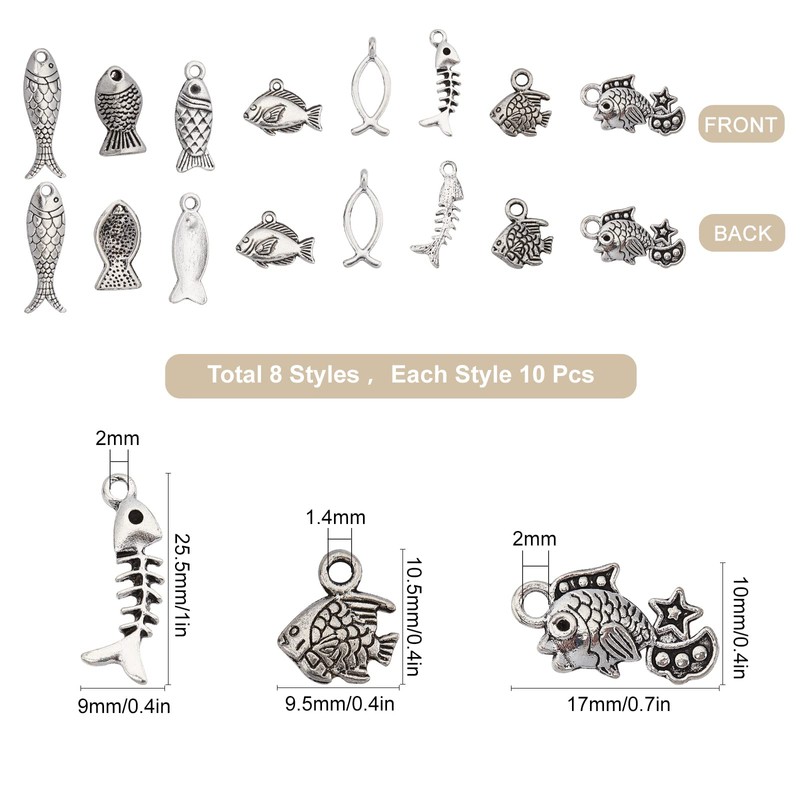 - ❤[1 BOX 80PCS FISH CHARM SILVER]: Fish charms in 8 styles, each style 10pcs, antique silver: the largest size is 25.5x9x2mm; the smallest size is 20x8mm; hole: 1~2mm; all storage in a plastic box: 7.4x7.2x1.7cm.