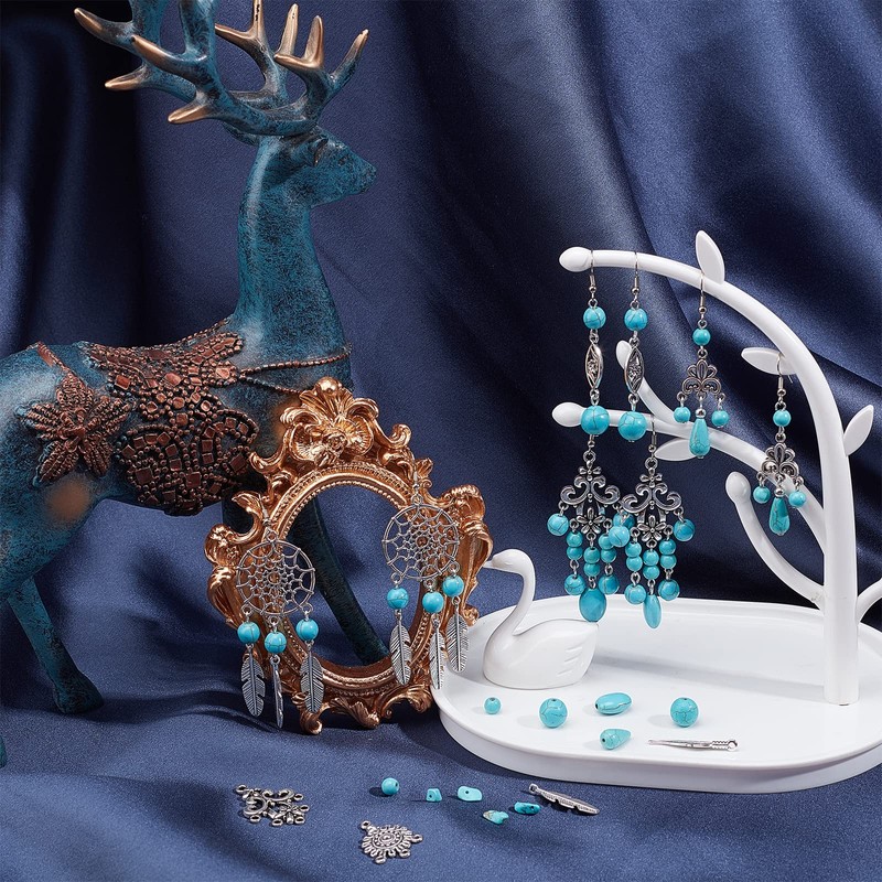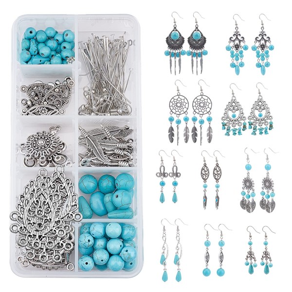 - ❤[DIY 10 PAIRS TURQUOISE EARRINGS MAKING KIT]: 100pcs 4 styles x Synthetic Turquoise Beads; 20pcs 4 styles x Alloy Leaf Pendants; 20pcs x Tibetan Style Spacer Beads; 20pcs x Alloy Links connectors; 30pcs x Brass Eye Pin; 50pcs x Flat Head Pins; 20pcs x Brass Earring Hooks; 1pc x SUNNYCLUE Box.