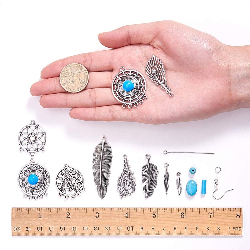 - ❤[All INCLUSIVE]: 36pcs x 8 Style Alloy Feather Charms Pendants; 24pcs x 3 Shape Gemstone Turquoise Beads; 6pcs x 3 Style Dreamcatcher Earring Charm Connectors; 16pcs x Brass Earring Hooks; 30pcs x Iron Eye Pin; 30pcs x 5x0.7mm Iron Jump Rings; 1pc x 11x7x3cm Plastic Box; 1pc x Paper Instruction; 1pc x SUNNYCLUE Blue Gift Box.