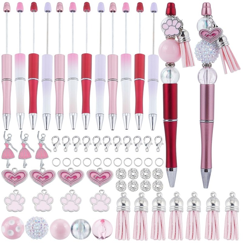- [138PCS BEADABLE PEN KIT]: You will receive 12pcs beadable pen blanks in 4 styles, 12pcs faux suede tassels, 4pcs rhinestone large beads, 32pcs round acrylic beads, 24pcs rhinestone spacer beads, 4pcs pet paw charms, 4pcs heart charms, 4pcs ballet charms, 12pcs lobster clasps and 30pcs jump rings.