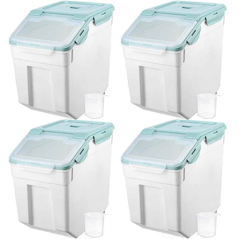 Sunnyray 4 Pcs 55 lbs Grain Rice Storage Container Blue Flour Bin with Wheels Cup Leak Proof Pet Food Storage Boxes Seal Locking Lid Plastic Rice Containers Set for Cereal Flour Cat Dog Food Kitchen