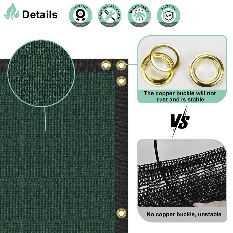 • Grommets: Made of stainless copper, each corner has 3 grommets, strong grommets are placed evenly along all edges, All edges are covered with black reinforced 3-inch binding. The grommets and bindings help the screen to hold up in the wind