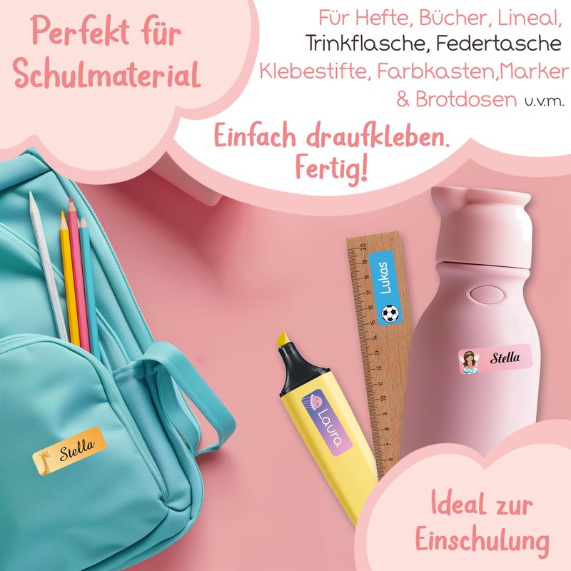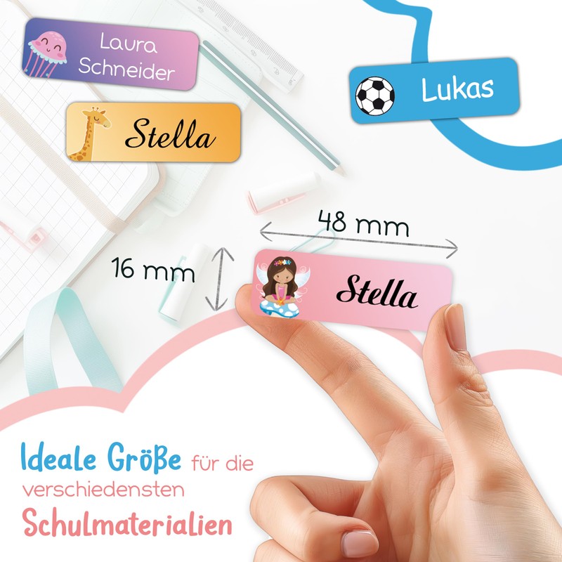 - Waterproof address labels for your utensils. From the lunch box to the ruler, from books to a spoon. Size approx. 48 x 16.5 mm - 38 different backgrounds to choose from - 60 labels.
