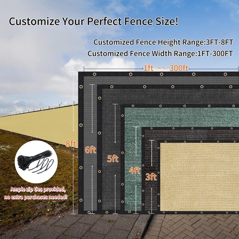 - [Customized Sizes for Your Needs] At Sunocity, we're experts in crafting fence screens with one goal in mind – your satisfaction. Whether you need a screen that's 1 foot or 300 feet wide, and 3 to 8 feet tall, we're here to meet your specific requirements. Contact us today to bring your vision to life.