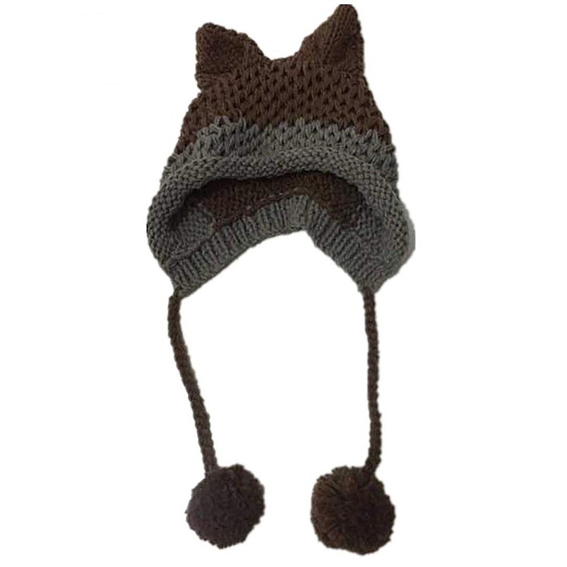 SUNONE11 Fox Ears Beanie Winter Warm Handmade Knitting Pompom Patchwork Crochet Headpiece Cap, Brown Gray, Small