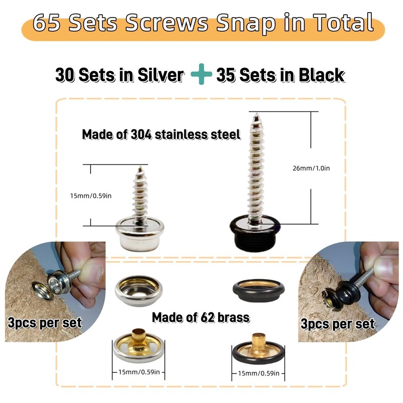 - Versatile Application: The canvas Snaps Button Screws are widely used for boat covers, canvas, tarps, tents, awnings, clothing, leather, furniture and etc. Fit for both indoor and outdoor use. Perfect for DIY.