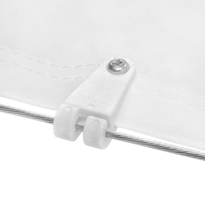 - Convenient installation and operation: for mounting the sail, the enclosed 20 running hooks are simply screwed to the sail at the desired distance and can then be attached to the parallel tensioned stainless steel ropes by clicking method.