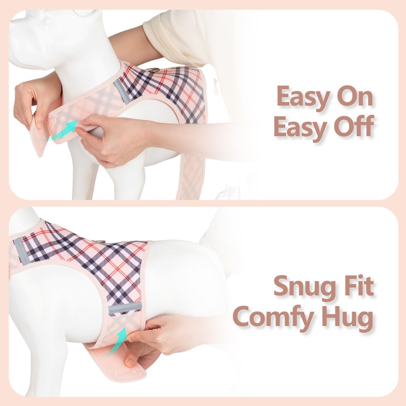 - Easy Wrap & Secure Design: No buckles or clips! No step-in needed! Simply open the two wide hoop-and-loop panels (neck and chest), wrap the harness around your dog, and press firmly for a secure, instant fit. Achieves an escape-proof hold in seconds – zero head-struggle for your pup and effortless for you