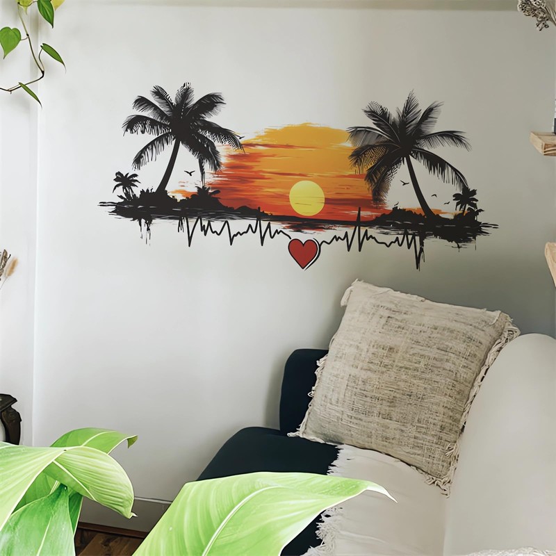 Sunset Coconut Beach Wall Stickers, sacinora Romantic Setting Sun Wall Decals Removable Vinyl Peel and Stick for Living Room Bedroom Kitchen Sofa TV Background Art Home Decorations