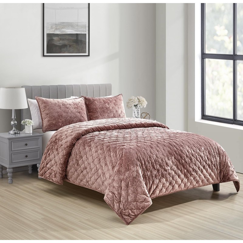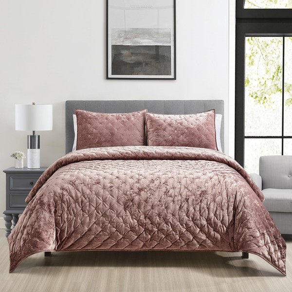 Sunshine Nicole Embroidery Quilt Set with Metallic Gold Thread, Distressed Velvet Face and Brushed Solid Microfiber Reverse, with Light Weight Soft Poly Fill, 3 Pieces Dusty Mauve Gold, Queen