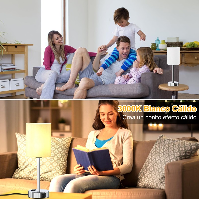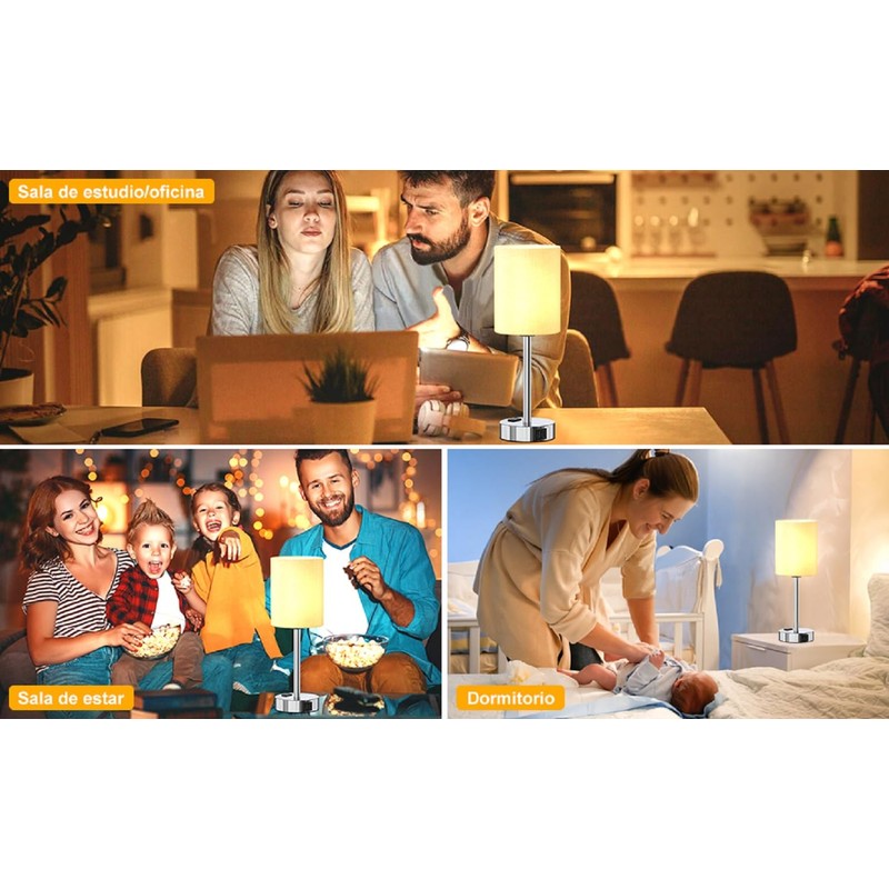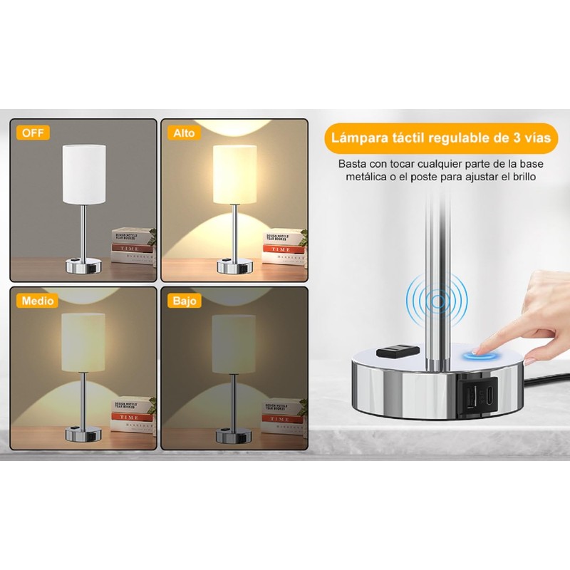 - Atenuación táctil -- Esta suave lámpara de mesa de control táctil regulable cuenta con sensor sensible al tacto, para hacer cambios rápidos a 3 niveles diferentes de brillo (Bajo, Medio, Alto), y suavizar el ambiente rápidamente para usted. Simplemente un toque o una palmadita en la base de las lámparas de mesilla de noche o en el poste de soporte de las lámparas cuando desee que la lámpara de mesilla de noche se encienda/apague, aumente/disminuya el brillo.