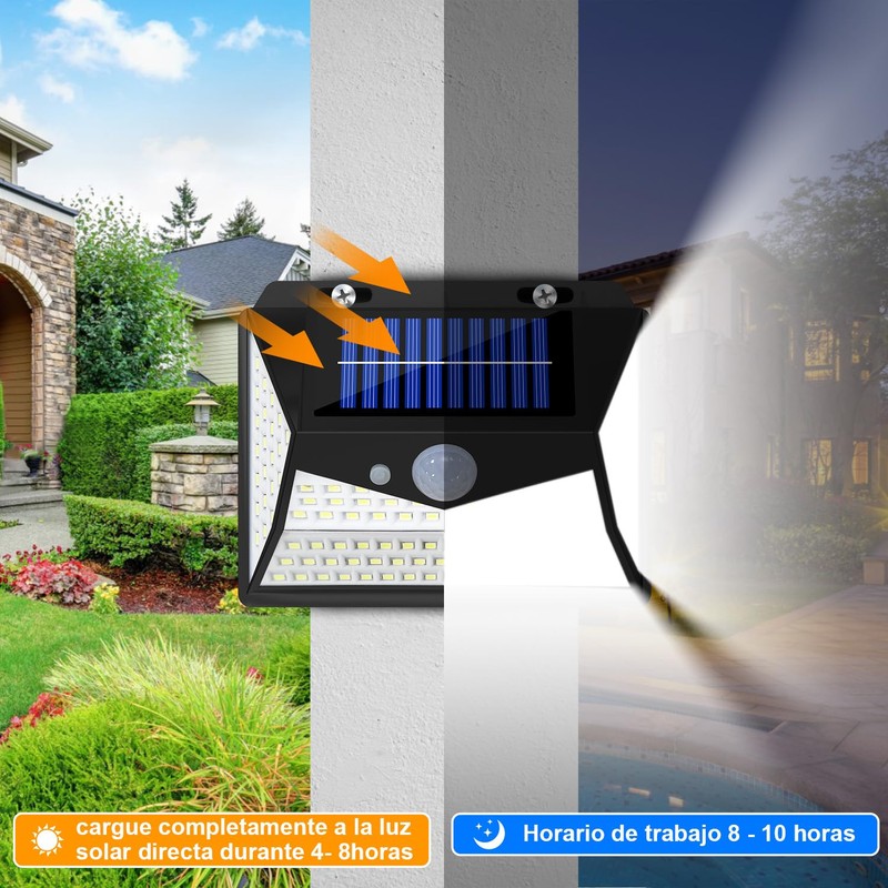 - 【Panel solar de alta eficiencia】Las luces solares para exteriores utilizan paneles solares de silicio, y la tasa de conversión es tan alta como 20.5%. Almacena un 15% más de electricidad que otros productos en el mismo tiempo de luz diurna. Las luces de exterior con sensor de movimiento solo necesitan cargarse al sol durante 8h durante el día, y pueden iluminarse por la noche cuando se detecta movimiento